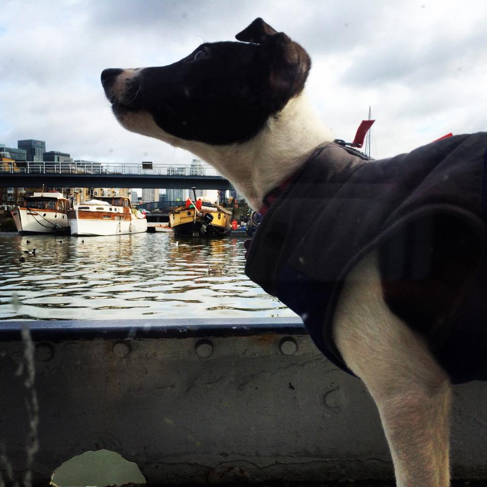 Dan on deck as the sunsets over South Dock Marina and Canary Wharf.