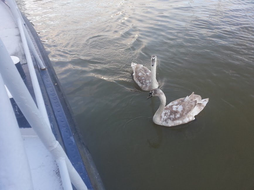 Ugly ducklings Posted on January 26, 2014 by Stephen Two young swans regularly visit the houseboat in the morning. They live on a floating reed bed on South Dock Marina.