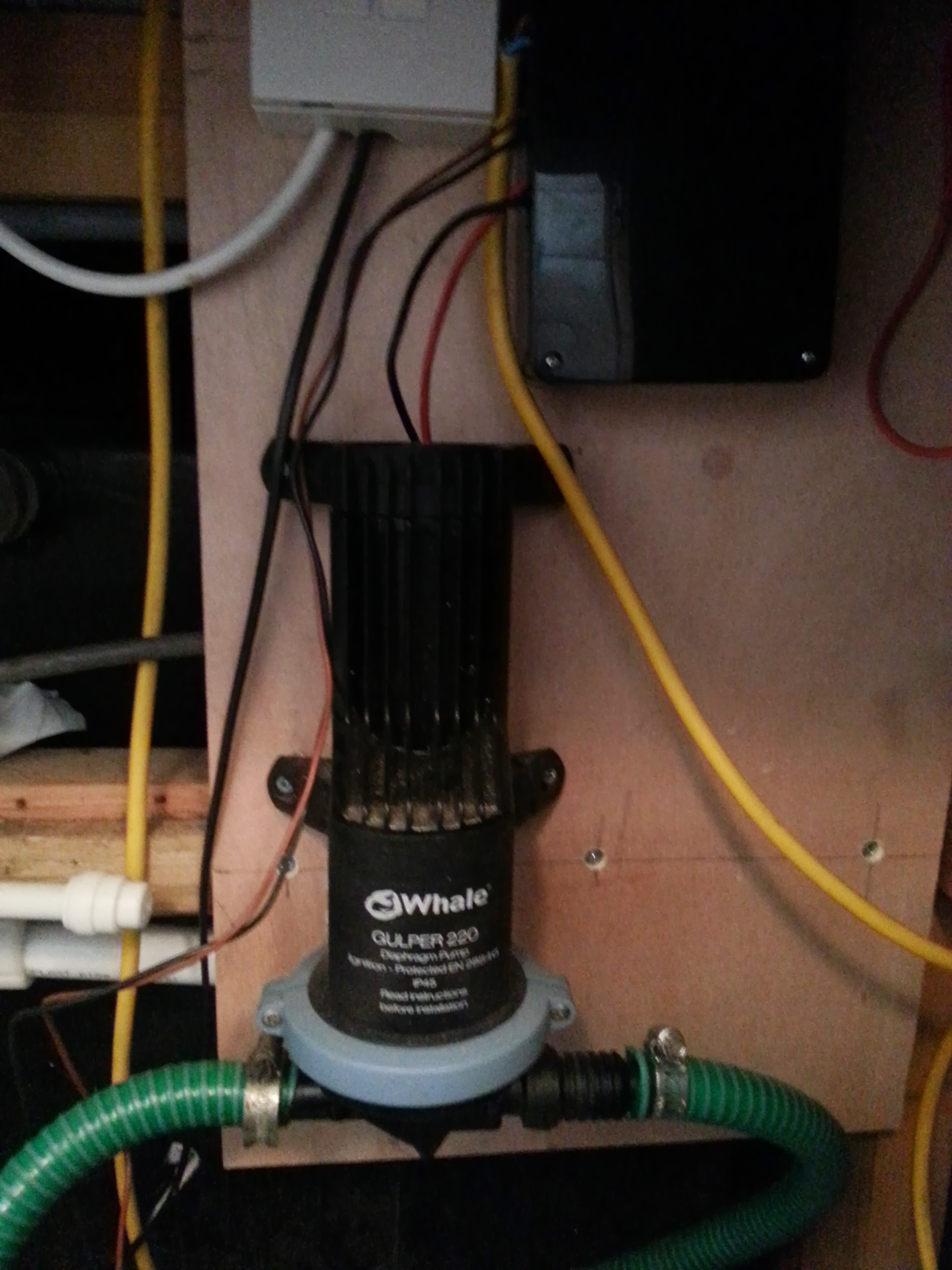 New grey water Whale tank. Product sheet here (PDF). It acts as a reservoir for grey water from the sinks, dishwasher and washing machine, and pumps water out into the dock.
